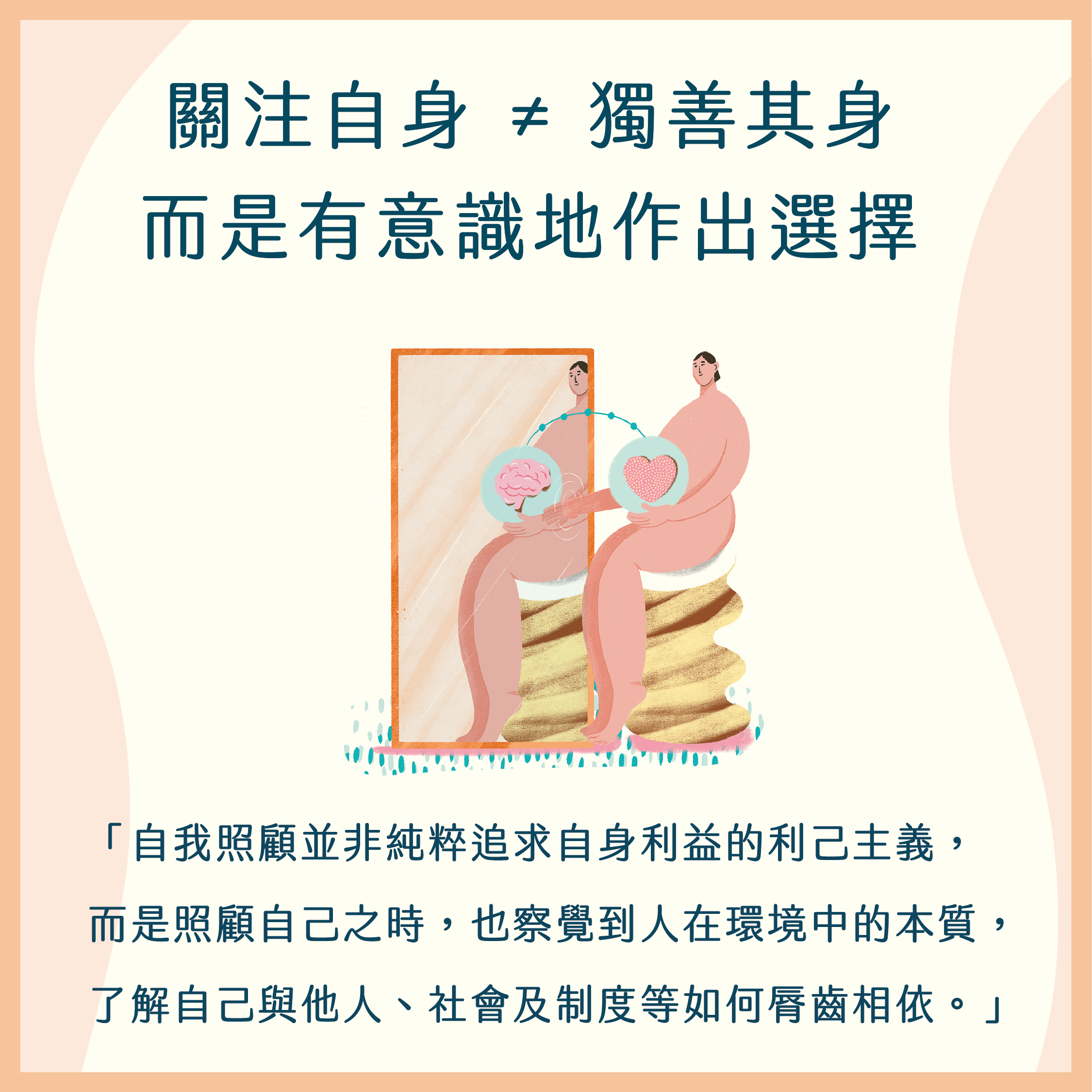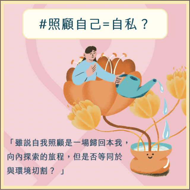「成日講照顧自己先,係咪好自私?」許多人以為,自我照顧是一個純粹向內的過程,以為我們觀察自身需要,了解自己,各種洞察與回應也源於自己。雖說自我照顧是一場歸回本我,向內探索的旅程,但是否等同於與環境切割?