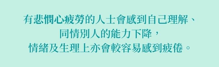 然而危中有機,悲憫心疲勞亦能轉化成自我察覺的良機,提醒服務提供者以自我關懷,照顧悲憫心疲勞的自己,專注靈魂的虛耗。有興趣了解更多排解悲憫心疲勞的方法,請密切留意我們的文章和講座,學習以自我慈心和其他方法照顧自己。