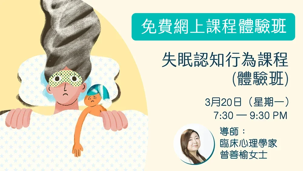 失眠是不少香港人有的情況,當中有各種原因。有見及此,心導遊+平台推出了一連6節,有實証支持的免費網上自學課程-失眠認知行為課程,供正經歷輕微至嚴重情緒困擾的會員參加。為了讓大家了解課程,誠邀大家參與這個兩小時的體驗班,一起淺嚐課程內容和練習,學習面對睡眠問題。