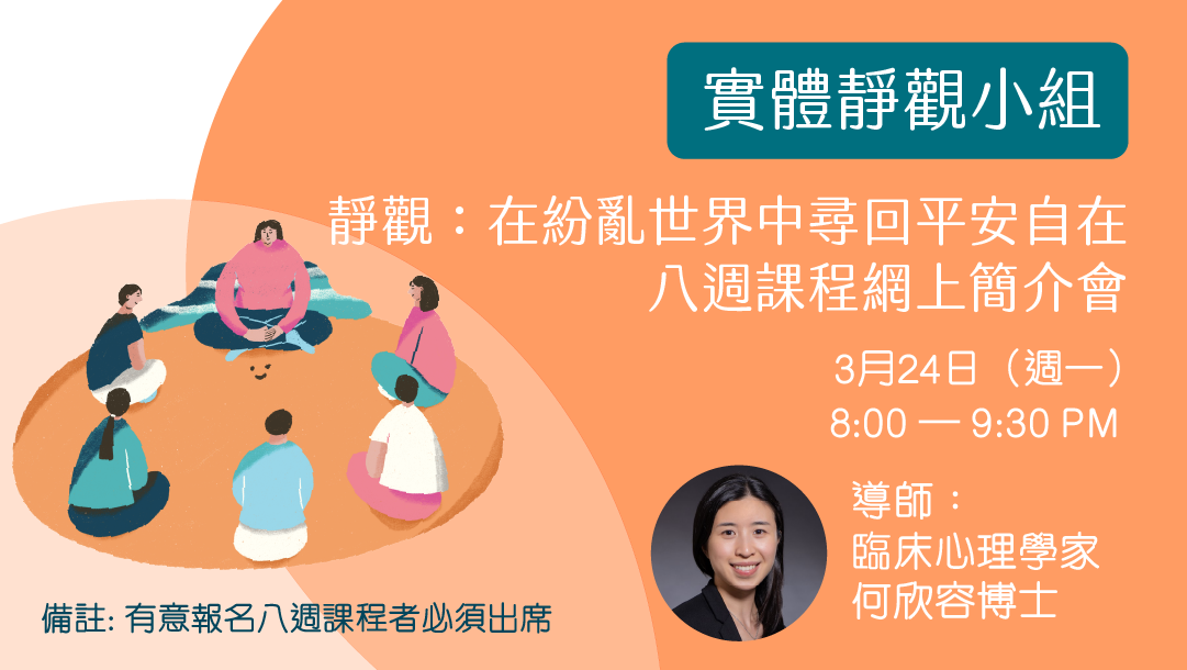 「靜觀:在紛亂世界中尋回平安自在」八週課程是由英國牛津大學靜觀中心Mark Williams 和Danny Perman 所編制,是靜觀認知療法的精簡版本。(可參考《Mindfulness: A Practical Guide to Finding Peace in a Frantic World》)。如欲參加課程,必須先出席此簡介會。