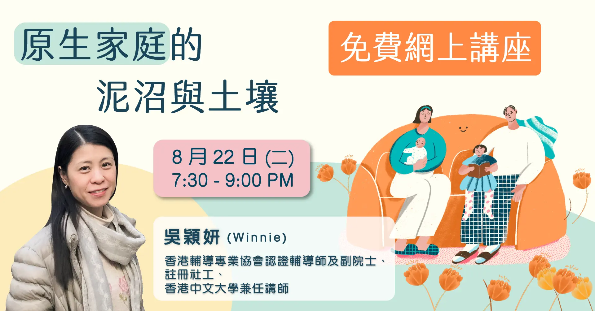 吳穎妍女士(Winnie Ng),香港中文大學社會工作碩士、香港輔導專業協會認證輔導師及副院士、註冊社工、香港中文大學兼任講師。她於中大的香港教育研究所教授相關輔導課程,以及在社會工作學系教授婚姻輔導;一直以家庭系統理論幫助當事人處理婚姻困難、親子關係、個人精神健康困擾及職場壓力等問題。