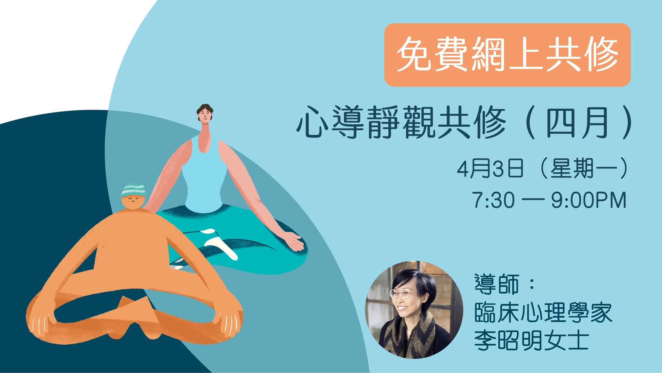 我們每月舉行的心導靜觀共修由臨床心理學家帶領,進行不同形式的靜觀練習 (包括:靜坐、靜觀伸展等),讓有參加我們平台靜觀課程的會員,透過共修和疑難解答,鞏固網上自助學習。我們亦歡迎有持續修習靜觀的朋友,透過共修連繫他人;或任何對靜觀有興趣的人士,來體驗靜觀。