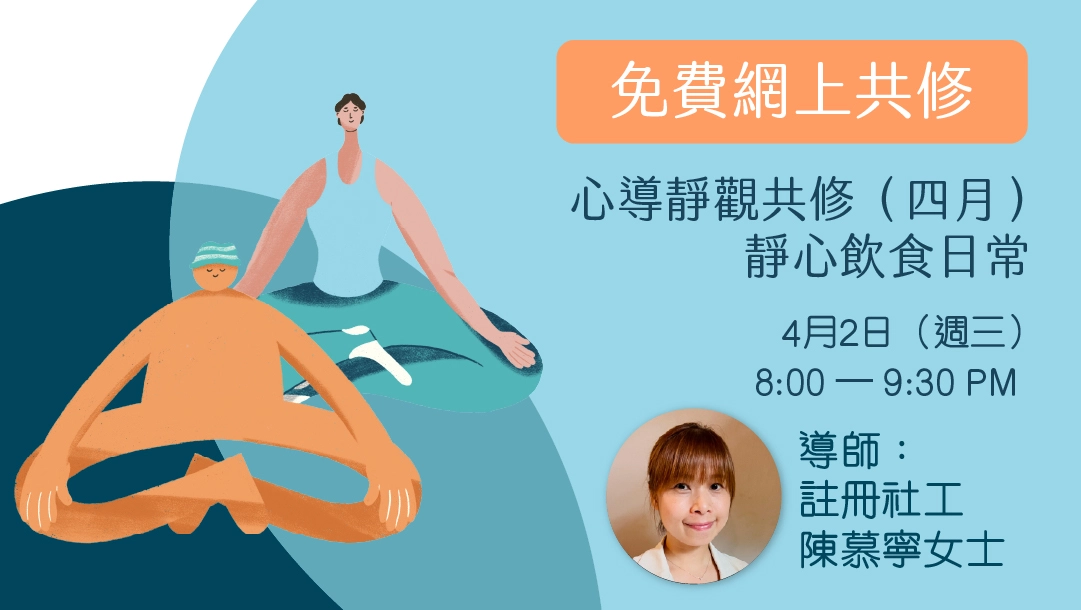 邀請你準備水和輕食,一起體驗靜觀進食,學習讓每一口都成為照顧自己的練習。(如你會在共修前進食晚餐,請不要吃得太飽;如你想於共修時進食晚餐,請準備輕盈的晚餐。)活動會以廣東話進行。