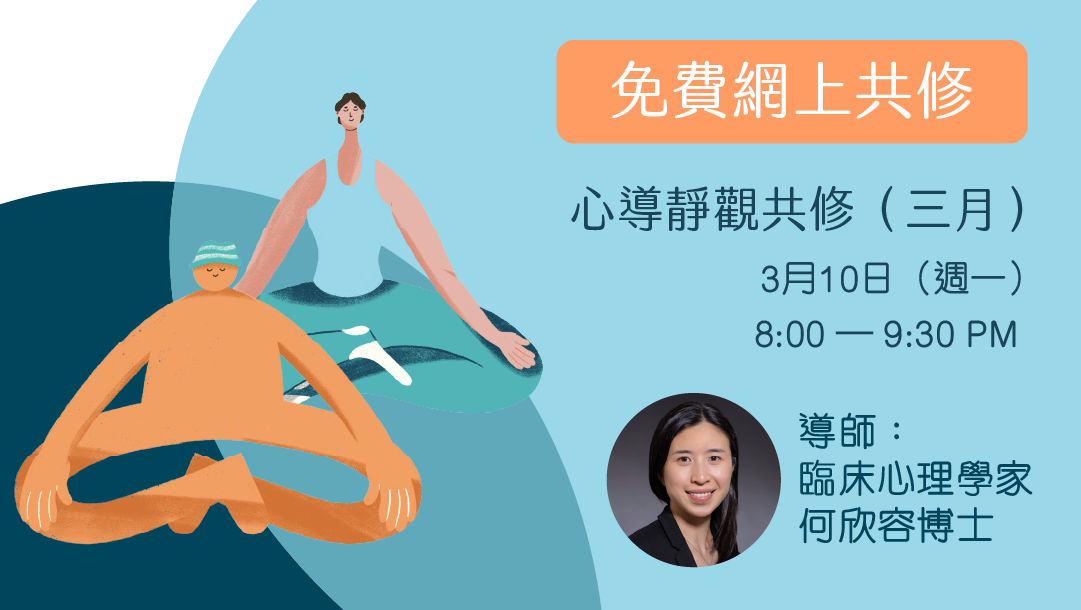 每月舉辦的心導靜觀共修,為你提供了一個探索、練習與分享靜觀經驗的平臺。無論你是初次接觸靜觀或是自學者,這個共修社群都提供一個互相支持的空間,讓你更深入地體驗靜觀的力量。這次共修將由臨床心理學家及靜觀導師Connie 博士帶領,跟我們一起進行不同的靜觀練習,並解答我們練習時遇到的疑難。
